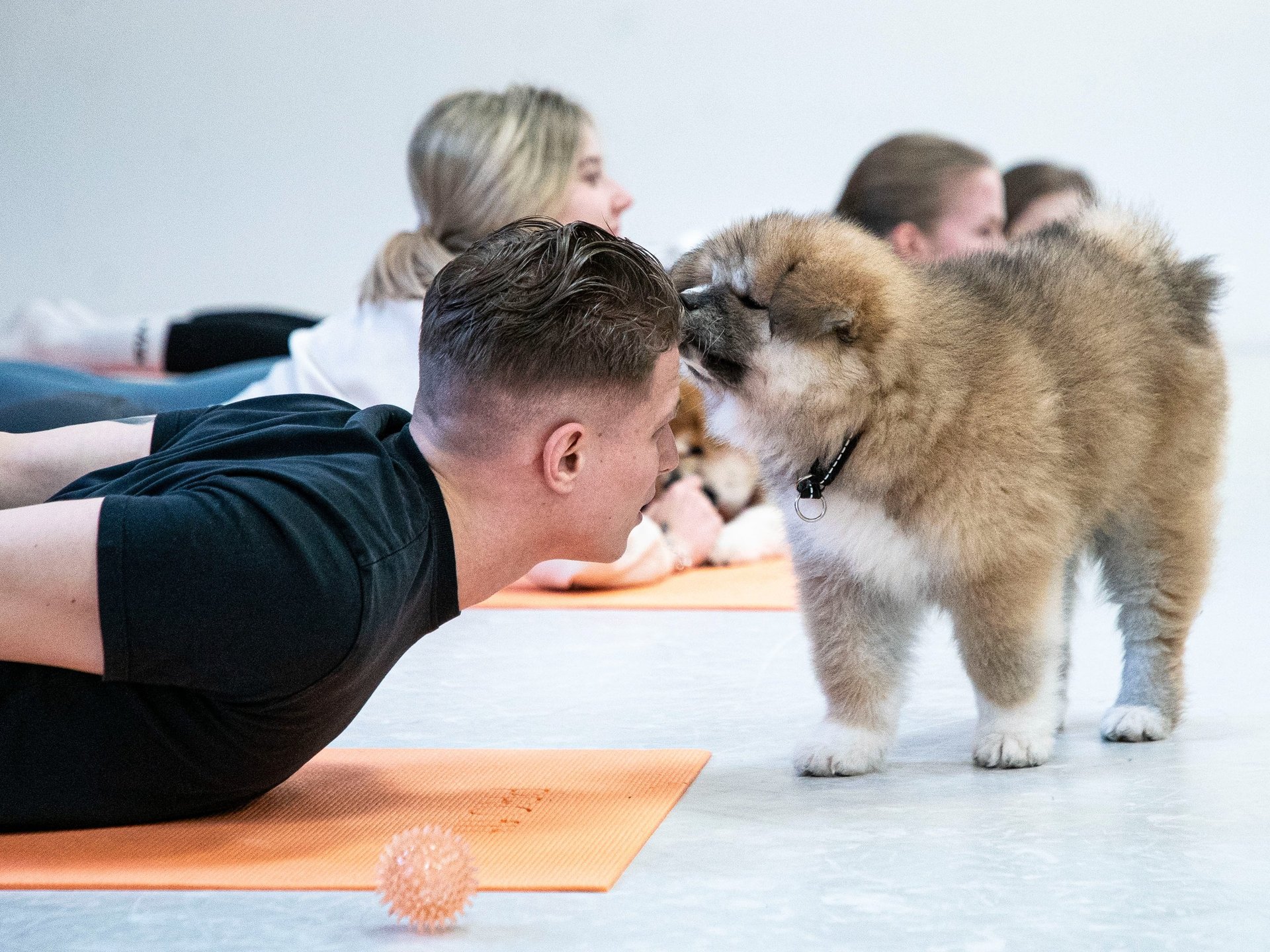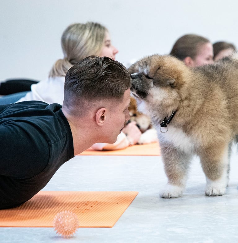 The yoga sessions are suitable for both beginners and advanced practitioners, featuring Hatha Flow yoga, also known as classical yoga practice. During the sessions, various stretching, posture improvement, and breathing exercises are performed. However, each participant can choose the intensity of the exercises based on their health condition. If a puppy comes to you, you can always pause your practice momentarily to enjoy the companionship and the positive energy provided.